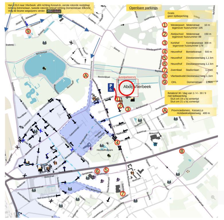 Geef als navigatieadres “Abdij Vlierbeek 1” in als bestemming. Dit toont je de weg naar de parking nabij de Westerpoort van de abdij.